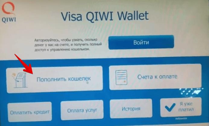 - На экране в терминале отыскать вариант с оплатой. Обязательно понадобится выбрать значок Киви, чтобы на сайт зачислить наличку.