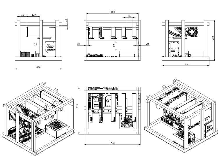 - Характеристики плат и комплектующих. Перед покупкой каркаса следует оценить габариты всех компонентов майнинговой системы, рассчитать уровень нагрузки на каждую рейку.
